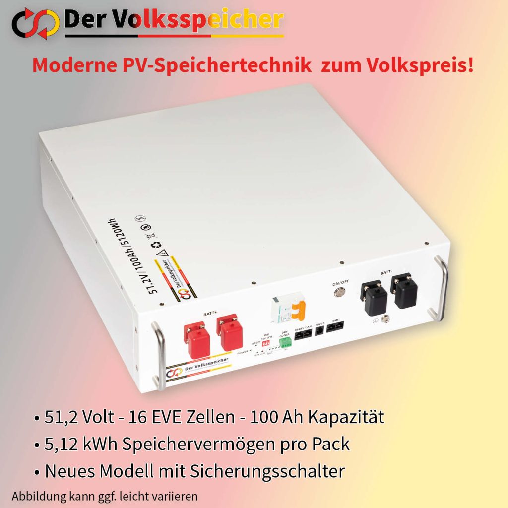 Sie suchen einen günstigen Speicher, der sich nicht verstecken muss? Dann ist der Volksspeicher die Lösung. Mit 5,12 kWh Speichervermögen und 51,2 Volt Spannung mit 16 EVE-Zellen, passt dieser Speicher in jeden PV-Haushalt – und ist komplett Installationsfertig.