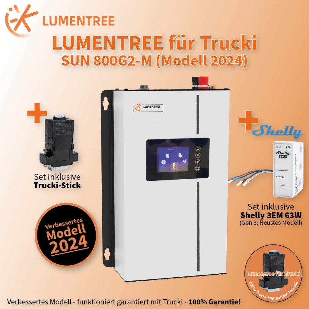Achtung: Nicht alle Lumentree SUN Wechselrichter, die auf dem Markt erhältlich sind, funktionieren mit Trucki. Hierfür braucht es eine bestimmte Firmware auf dem Gerät. Daher sollten Sie immer darauf achten, ob der Händler dies explizit angibt. Ist es nicht angegeben, kann davon ausgegangen werden, dass das Gerät nicht mit Trucki kompatibel ist.