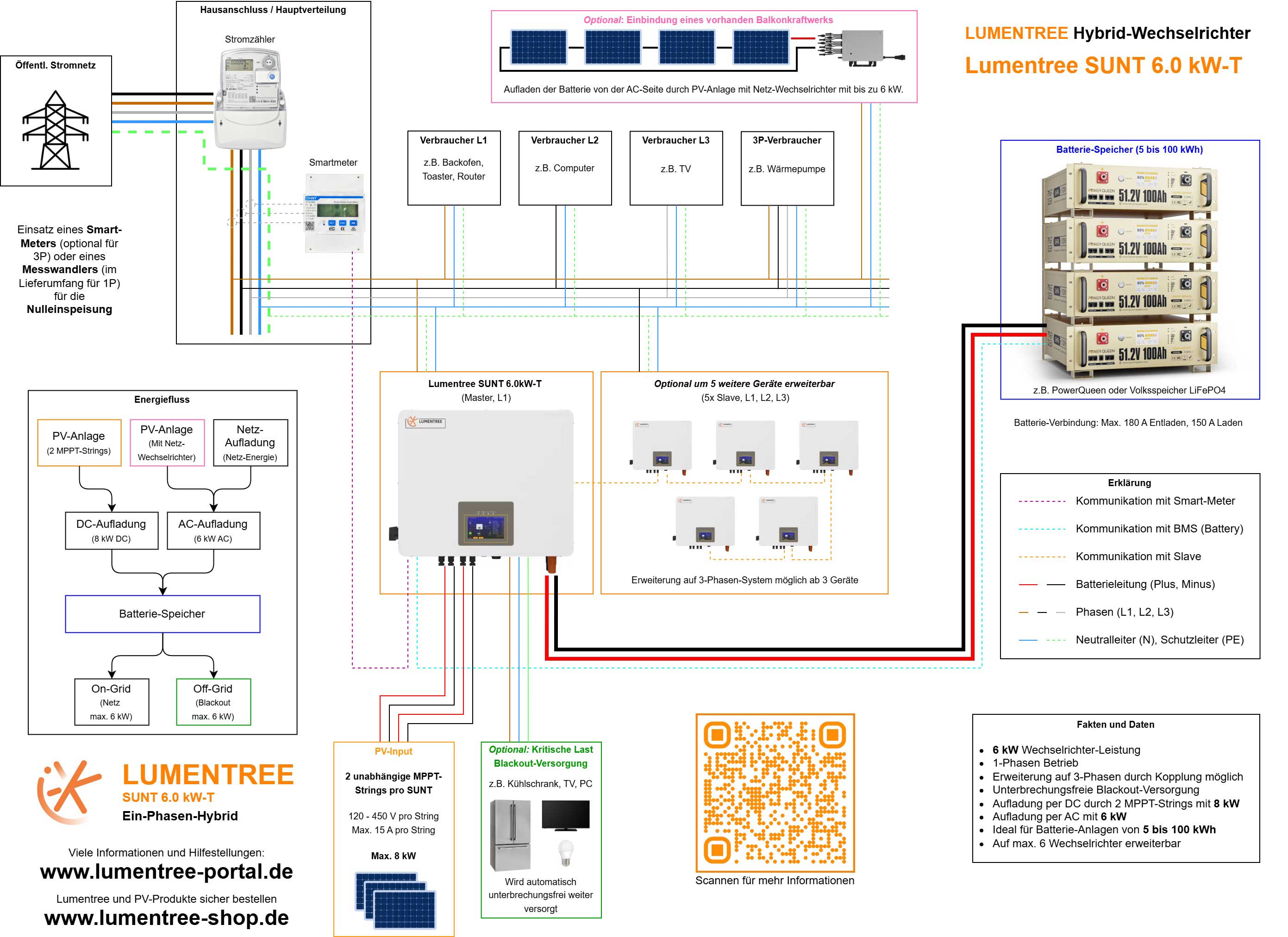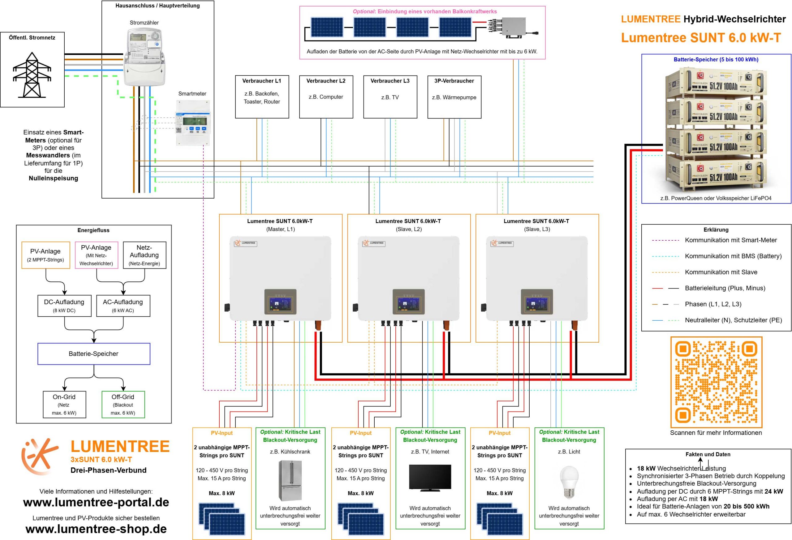 Sie können den Lumentree SUNT 6.0kW-T als 1-Phasen-Wechselrichter einsetzen oder ihn mit zwei weitere Lumentree SUNT 6.0kW-T als 3-phasiges Verbundsystem betreiben.