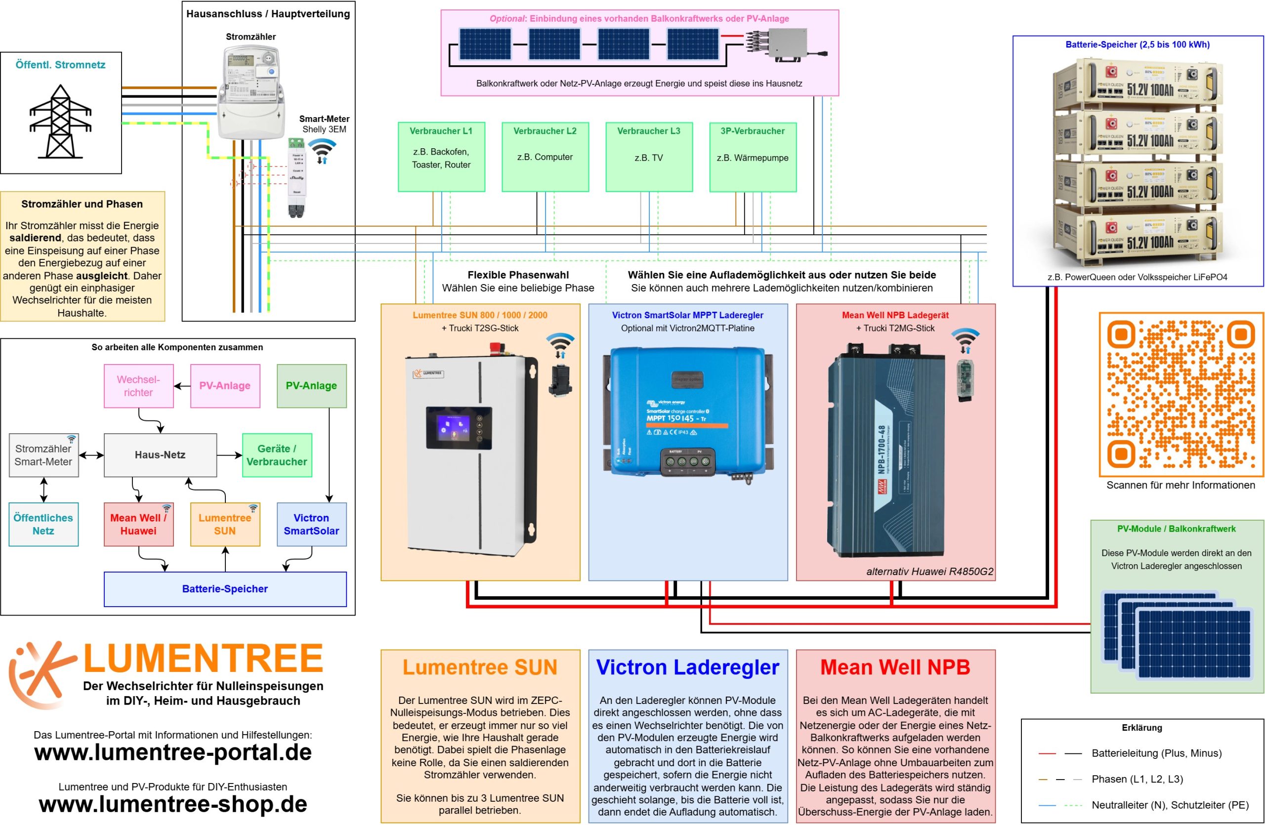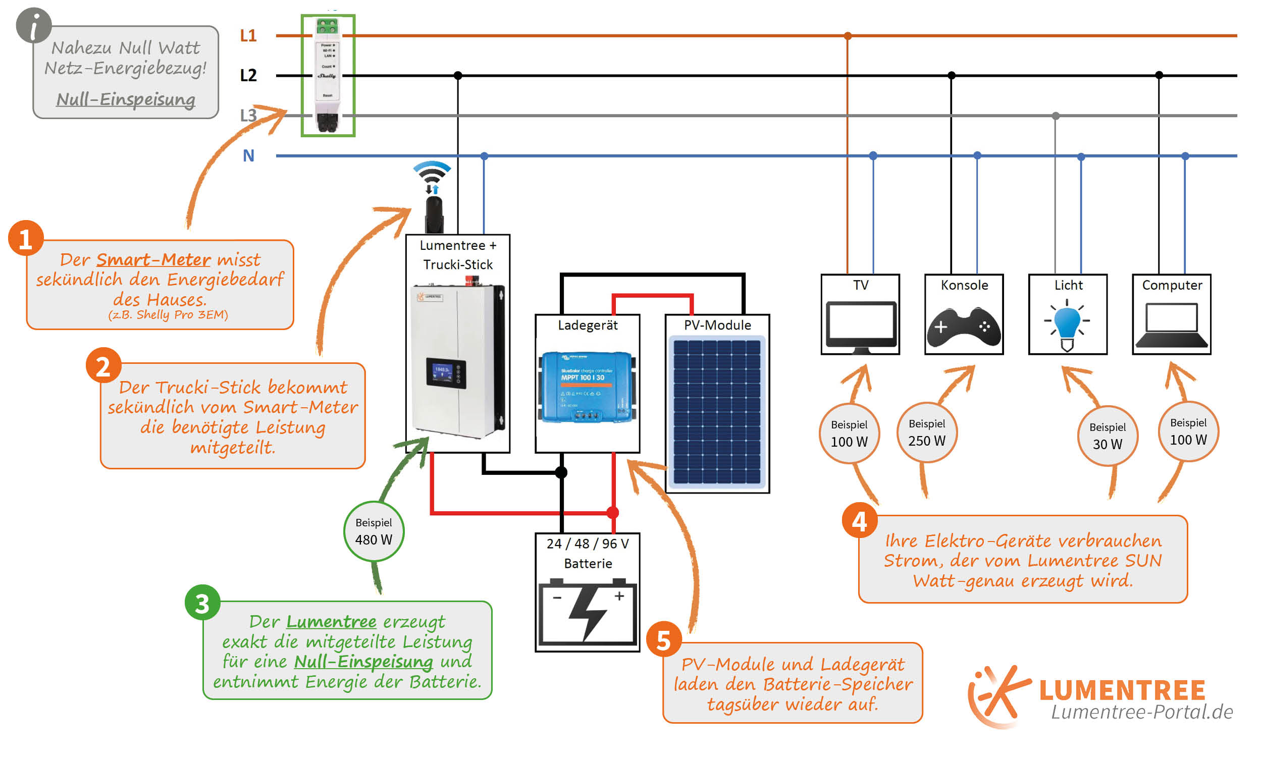 So können Sie mit dem Lumentree + Trucki Wechselrichter immer genau so viel Energie erzeugen, wie Sie tatsächlich brauchen. Und mit den Mean Well oder Huawei Ladegeräten + Trucki laden Sie immer genau soviel Energie in den Speicher, wie Ihr Balkonkraftwerk erzeugt. Das nennt sich Nulleinspeisung.